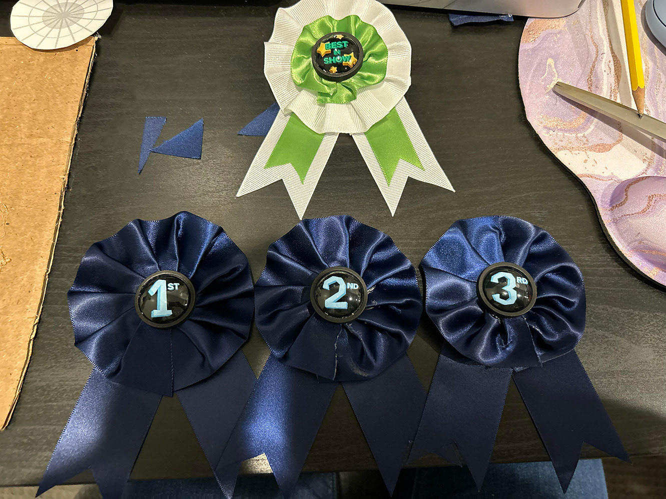 In addition to that, I voluntarily made ribbons for the first through third place winners and best in show in both Fine and Applied Arts. The reason I made the ribbons was for the attendees to more easily identify the winners and congratulate them.