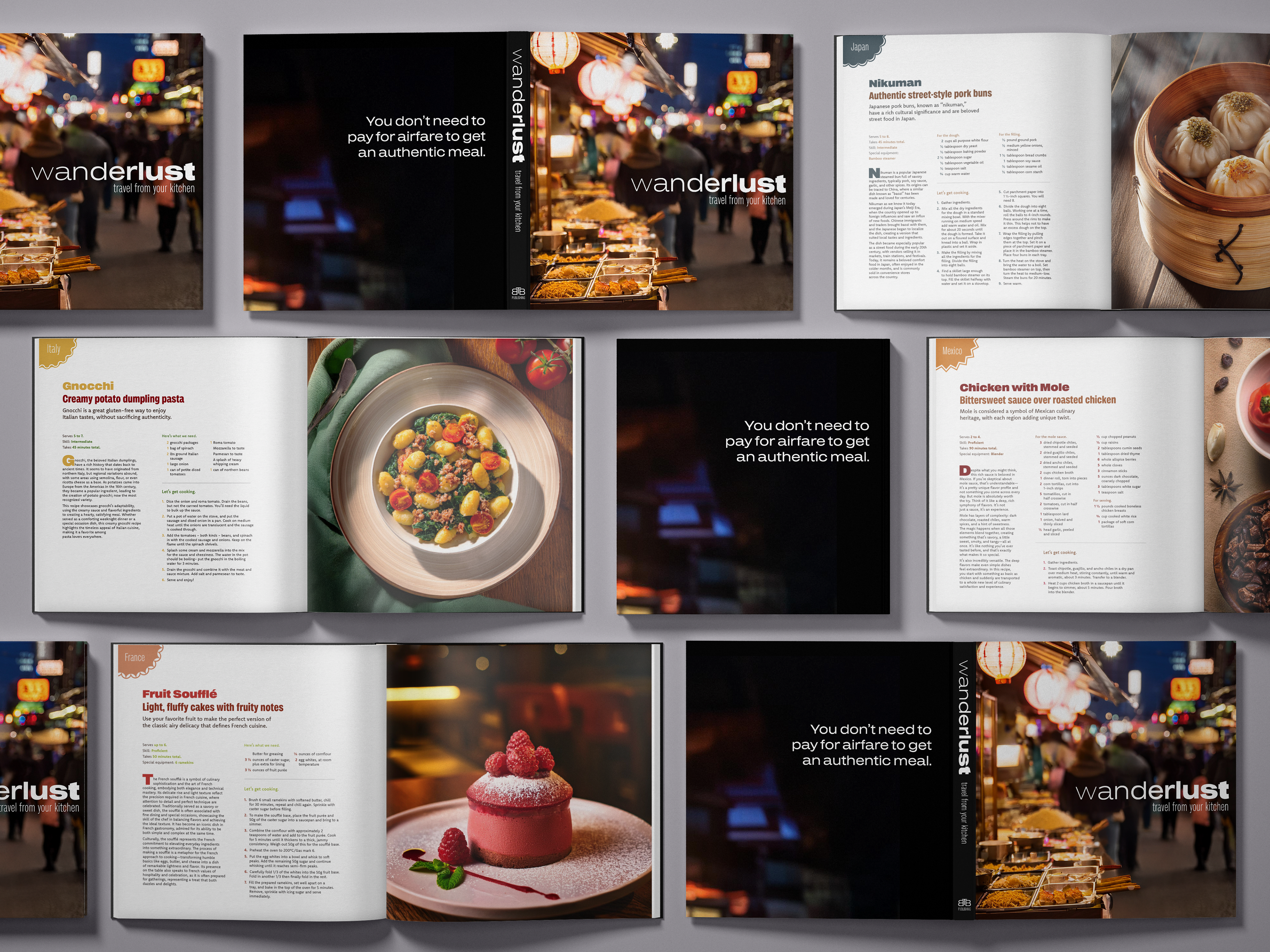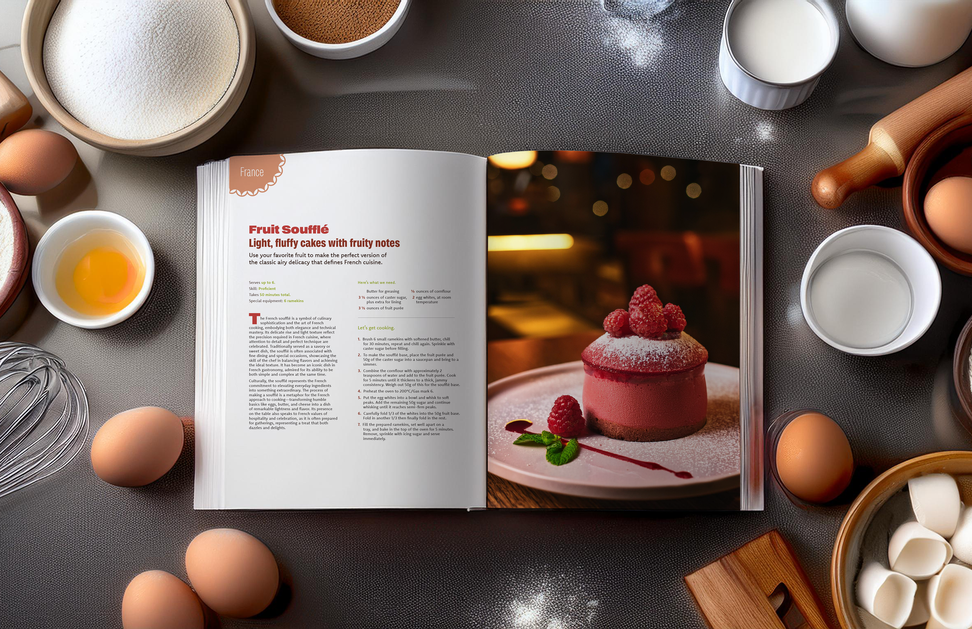 Design 4 beautifully typeset cookbook spreads and a cover, all consistent in theme.