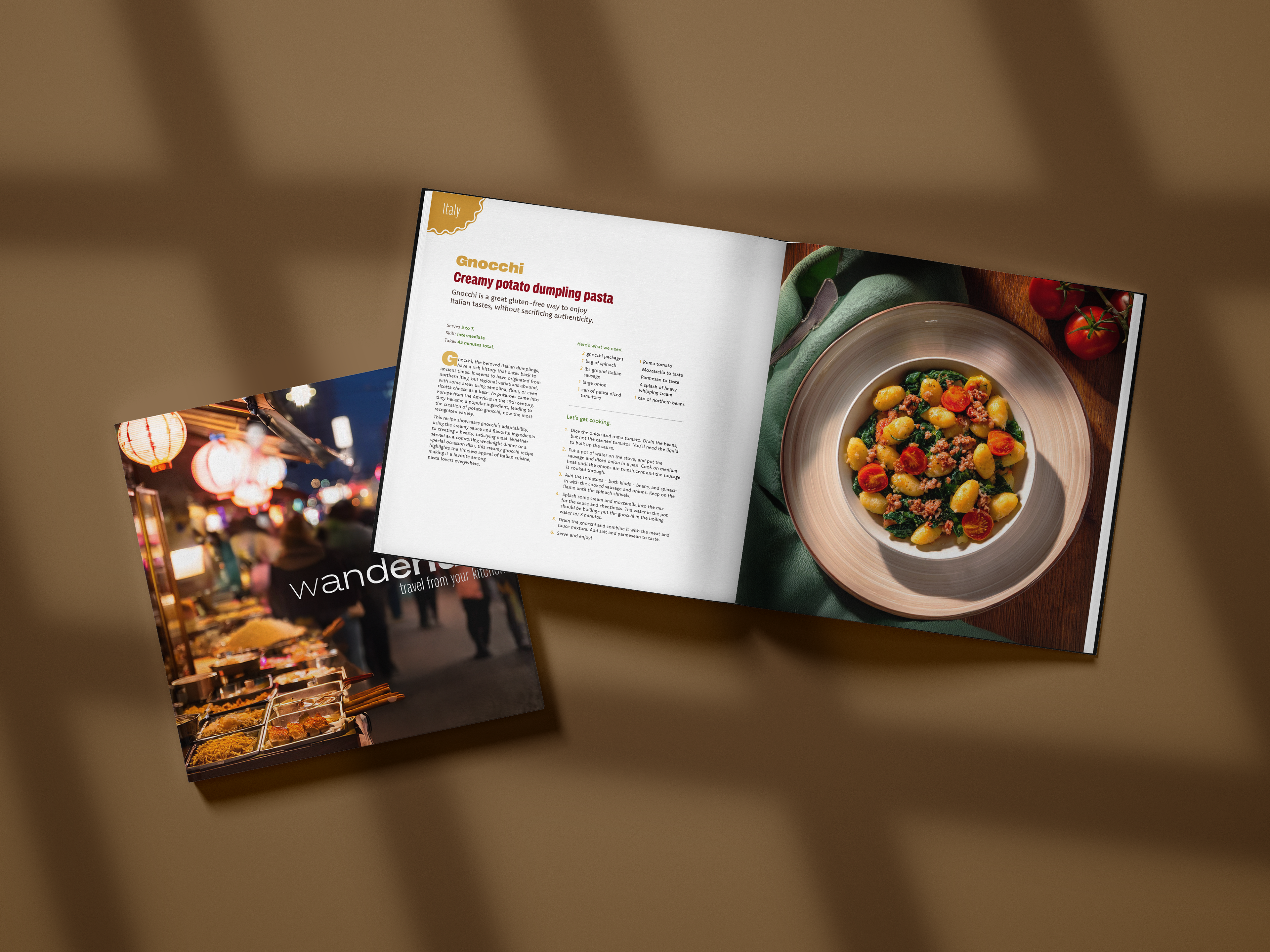 The idea behind the visual language is the warmth and excitement that immersion in a new culture can bring you. In order convert this idea into usable design elements, I decided to use Adobe Firefly to generate professional grade images that had a consitent feel and style. The typography was meant to be clean and easily digestable in order to uncomplicate the cooking process, and to compliment the large photo on the following page.